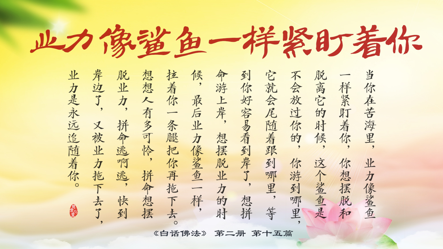 第三,当你在苦海里,业力像鲨鱼一样紧盯着你,你想摆脱和脱离它的时候,这个鲨鱼是不会放过你的,你游到哪里,它就会尾随着跟到哪里,等到你好容易看到岸了,想拼命游上岸,想摆脱业力的时候,最后业力像鲨鱼一样,拉着你一条腿把你再拖下去。想想人有多可怜,拼命想摆脱业力,拼命逃啊逃,快到岸边了,又被业力拖下去了,业力是永远追随着你。