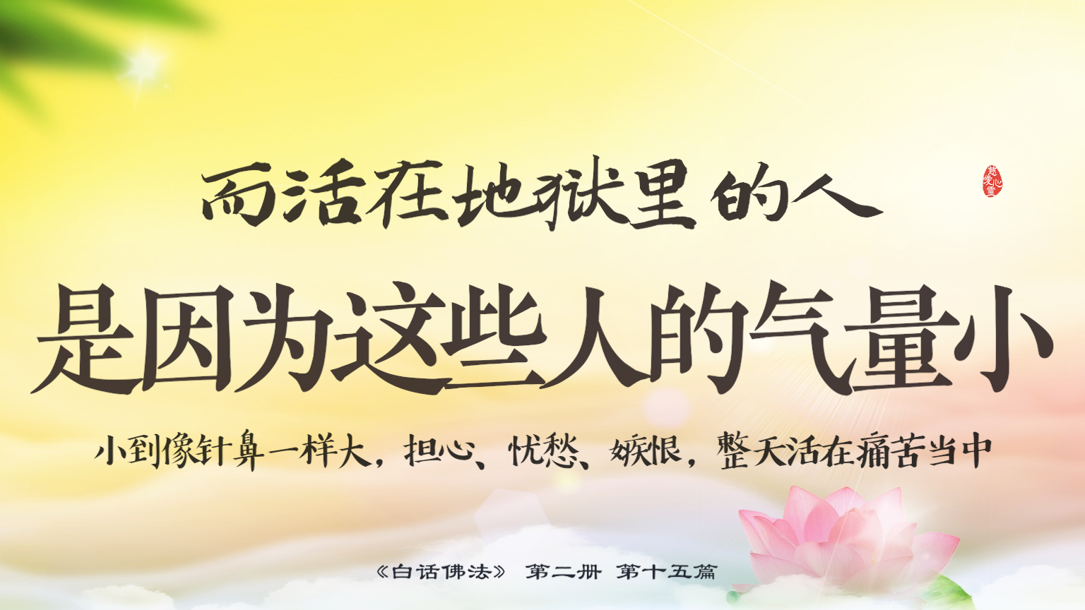 我们要做圣人,而不要做小人,同样是人,有些人活着就像在地狱里,而有些人却活在天上,活在天上的人,是因为他的心像天一样的开阔,而且他没有任何的杂念。而活在地狱里的人,是因为这些人的气量小,小到像针鼻一样大,担心、忧愁、嫉恨,整天活在痛苦当中。师父让你们修心是让你们好好改正自己身上的毛病,要把心胸修得像大海一样宽广。