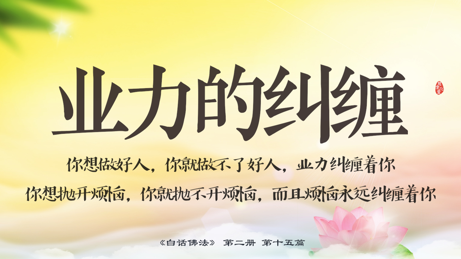 接下来给你们讲业力的纠缠,你想做好人,你就做不了好人,业力纠缠着你;你想抛开烦恼,你就抛不开烦恼,而且烦恼永远纠缠着你。比如想做个好人,而脑子里杂念四起,一会儿坏的意念又来了,这些坏的意念、烦恼都是自己找来的,推又推不掉,这个好人怎么做呢?