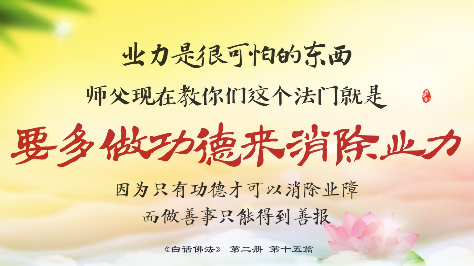 当业力来的时候,像火山爆发一样,你一边逃,一边看,那种恐怖的力量你是无法逃脱的,若稍不留神就会把你熔进去,就会被熔化在业力里面,所以业力是很可怕的东西,师父现在教你们这个法门就是要多做功德来消除业力,因为只有功德才可以消除业障,而做善事只能得到善报。