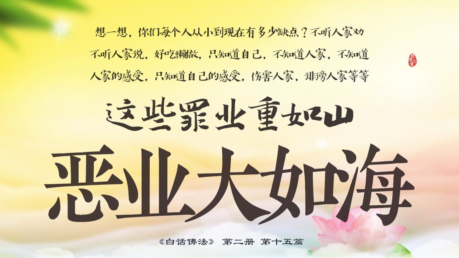师父常说每个人的业障像海一样大,像山一样大,因为山是很重的,海是很广的,也就是说这个人浑身都是毛病,犹如山一样大、海一样广,业障在身上,没有一个好的地方。想一想,你们每个人从小到现在有多少缺点?不听人家劝,不听人家说,好吃懒做,只知道自己,不知道人家,不知道人家的感受,只知道自己的感受,伤害人家,诽谤人家等等,这些罪业重如山,恶业大如海。