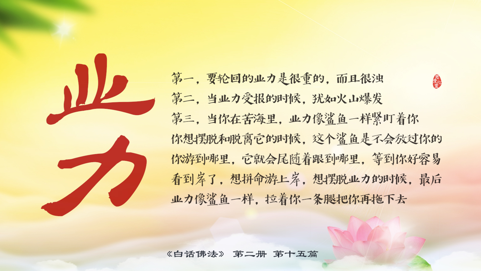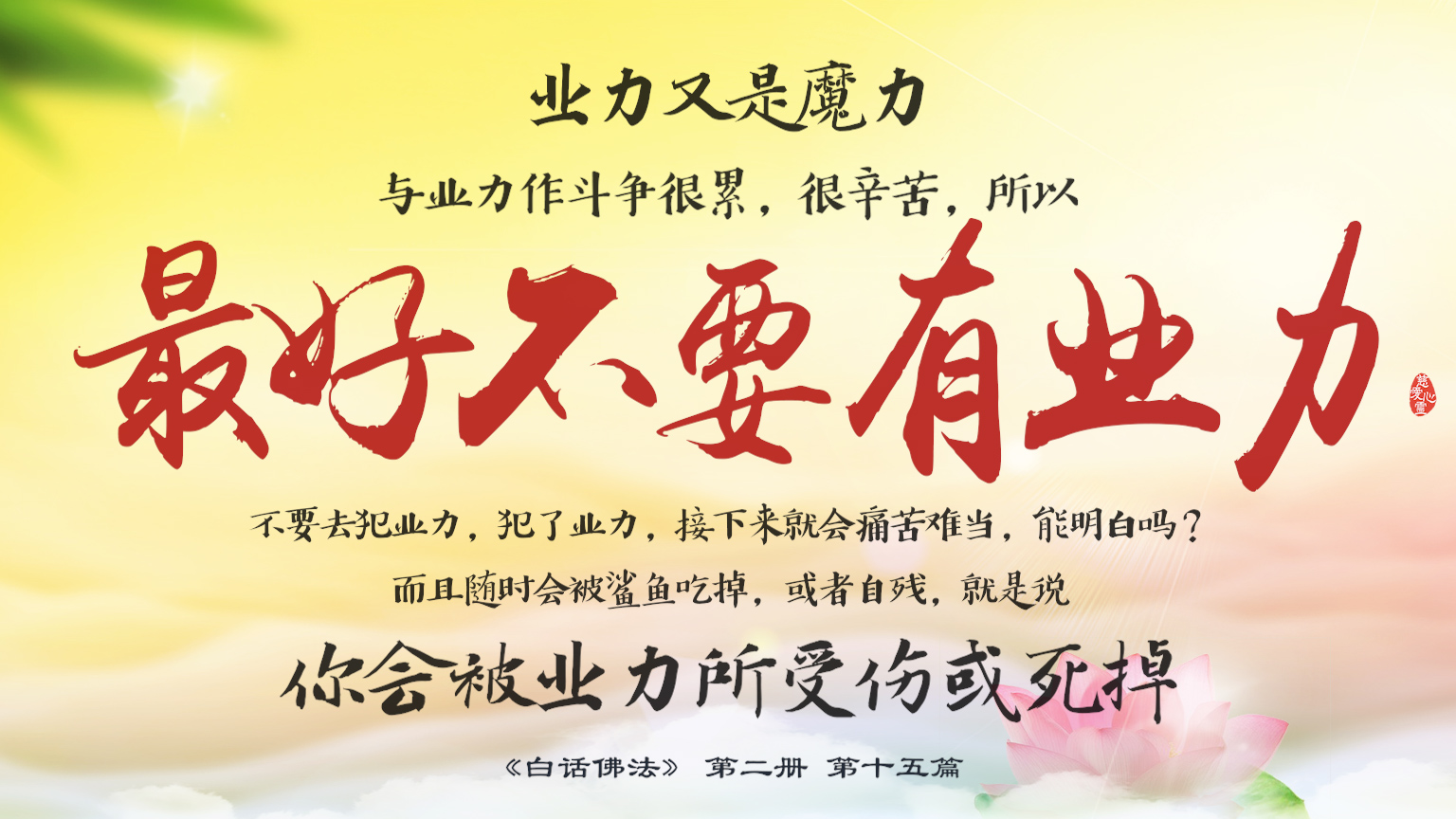 当你想离开苦海的时候,鲨鱼会把你咬回去,他不让你离开苦海,你要用你的根力,扎进你原始的佛性里面,就是说你如果想离开你的业障,你必须要有根力,就是你原始的佛性的力量,也就是你的本性,用佛菩萨的佛力和慈悲力来去除他,来解脱,否则全部的冤亲债主都会来找你的(秘书处按语:此节三,是台长分别在两个不同场合说的业力问题,与上次举例业障犹如鲨鱼有异曲同工之妙)。